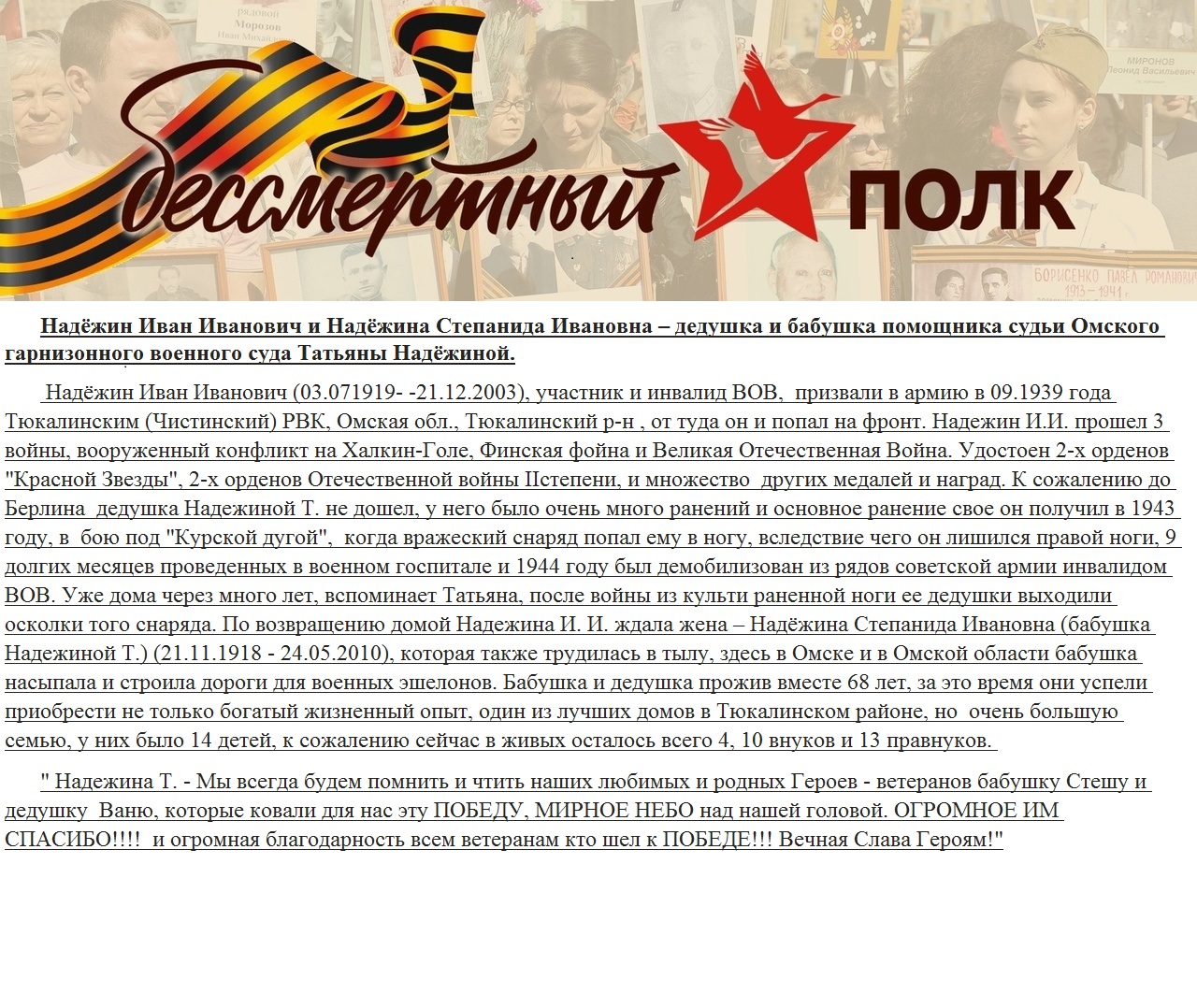 | "Бессмертный полк - 2025" В честь 80-й годовщины Победы в Великой Отечественной войне Омский гарнизонный военный суд продолжает цикл публикаций "Они живы - пока мы помним о них!" | версия для печати |